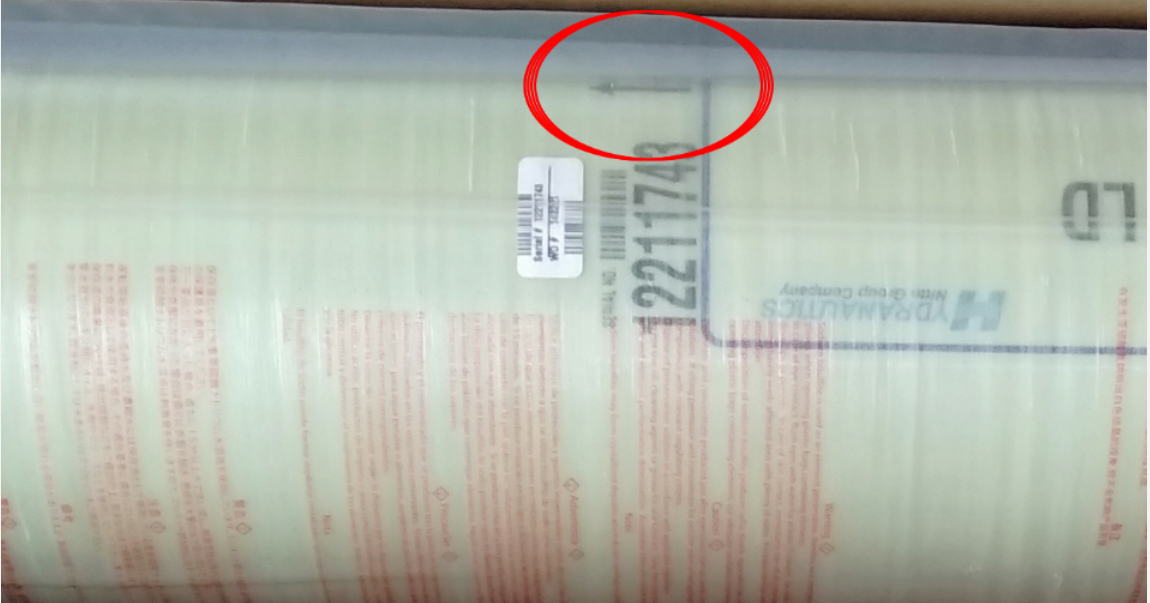 在找我們的反滲透ro膜安裝方向時,其實有一個簡單的方法,就是如下圖所示我們一般ro膜的膜元件上會有一個小箭頭,就是指的進水方向,根據這個箭頭然后對照進水方向安裝肯定是沒錯的。