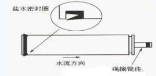 首先從紙板箱中取出膜元件,拆去塑料包裝袋。請注意,膜元件中有保護液,在操作時要小心。然后在膜元件上安裝鹽水密封圈:鹽水密封的方向如上圖所示。如果逆向安裝則不能發揮其作用,務請注意。
